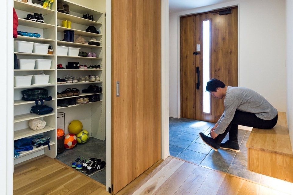 | 玄関 —シューズクローク | 家族用入口は引き戸。来客用玄関とは動線を分ける |