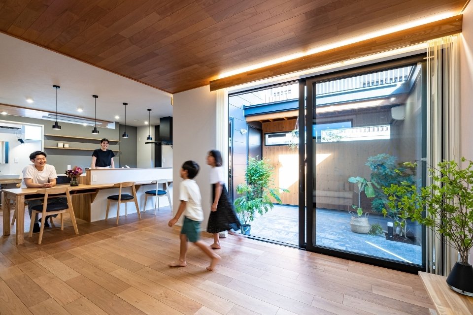中庭をLDKの延長として計画すると、視線が抜けて実際以上に広く感じられます。